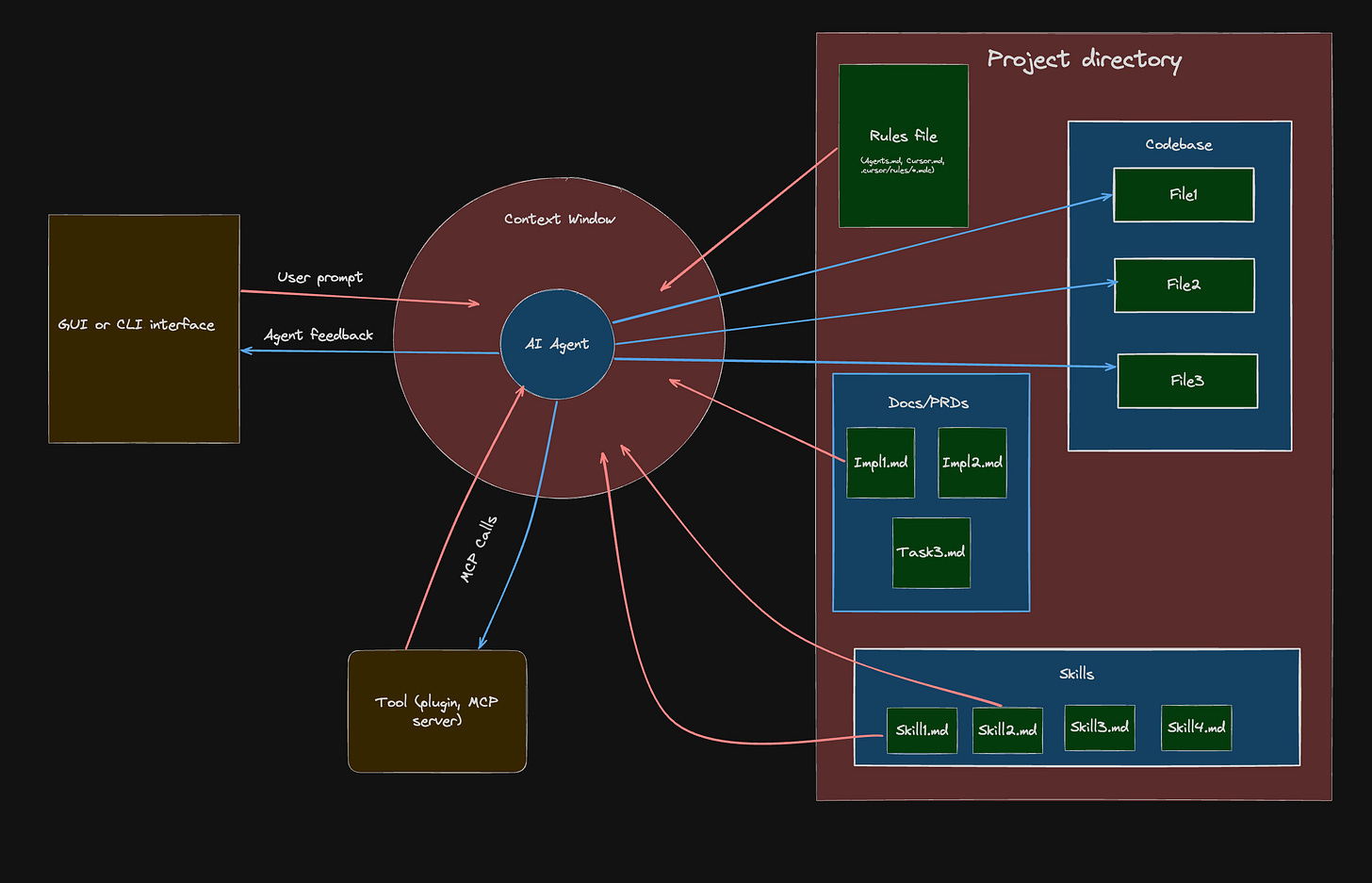 To understand how context-based engineering works with coding agents, it helps to visually see the architecture — how different components of your workspace interact with the agent.